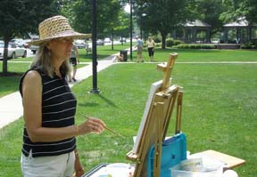 Living close to the turf and the sea, Joyce has been focusing on painting the worlds of thoroughbred racehorses and sailing — “the two most beautiful sports.” “In these sports there is so much beauty, so much emotion — so much to capture on canvas! It is great to watch or participate in the excitement of a sailboat race or the heart stopping thrill of thoroughbreds racing to the wire. There is a love of horses that parallels a love of boats, and you can see it in the care, up-keep, and time and money people invest in both. In thoroughbreds, man has harnessed the power of one of God’s greatest creatures, and in sailboats, man has created vessels to harness nature’s power of the wind.” From dawn to dusk, you may spot Joyce at various locations in her search for subjects to paint .